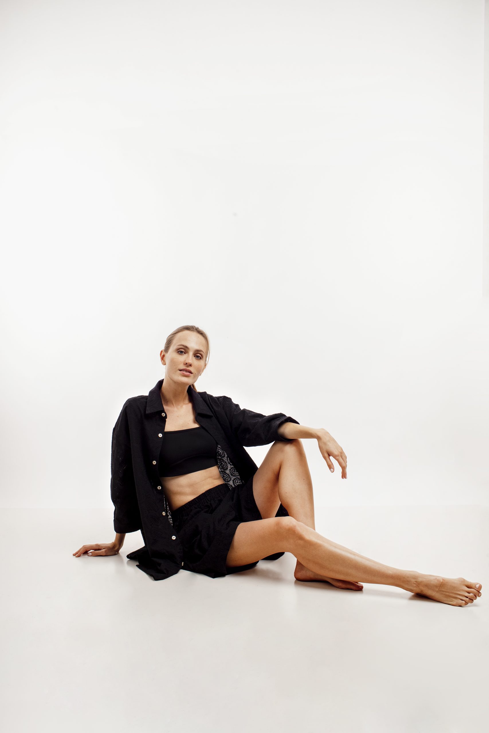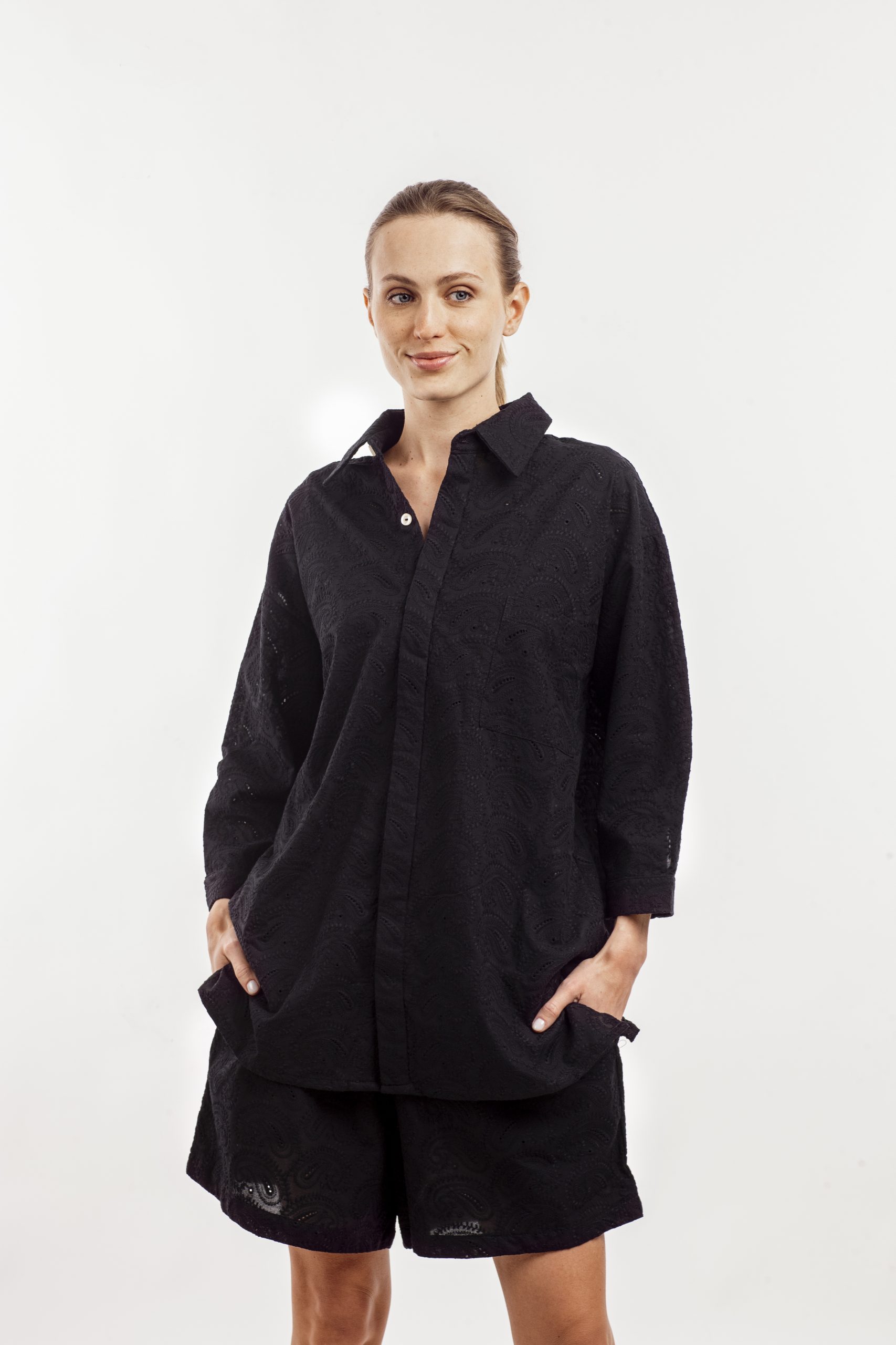 Los shorts de tiro alto cuentan con una pretina elástica cómoda y dos bolsillos laterales funcionales, manteniendo un balance perfecto entre confort y estilo. El broderie ligero y transpirable acompaña el cuerpo con elegancia y frescura.