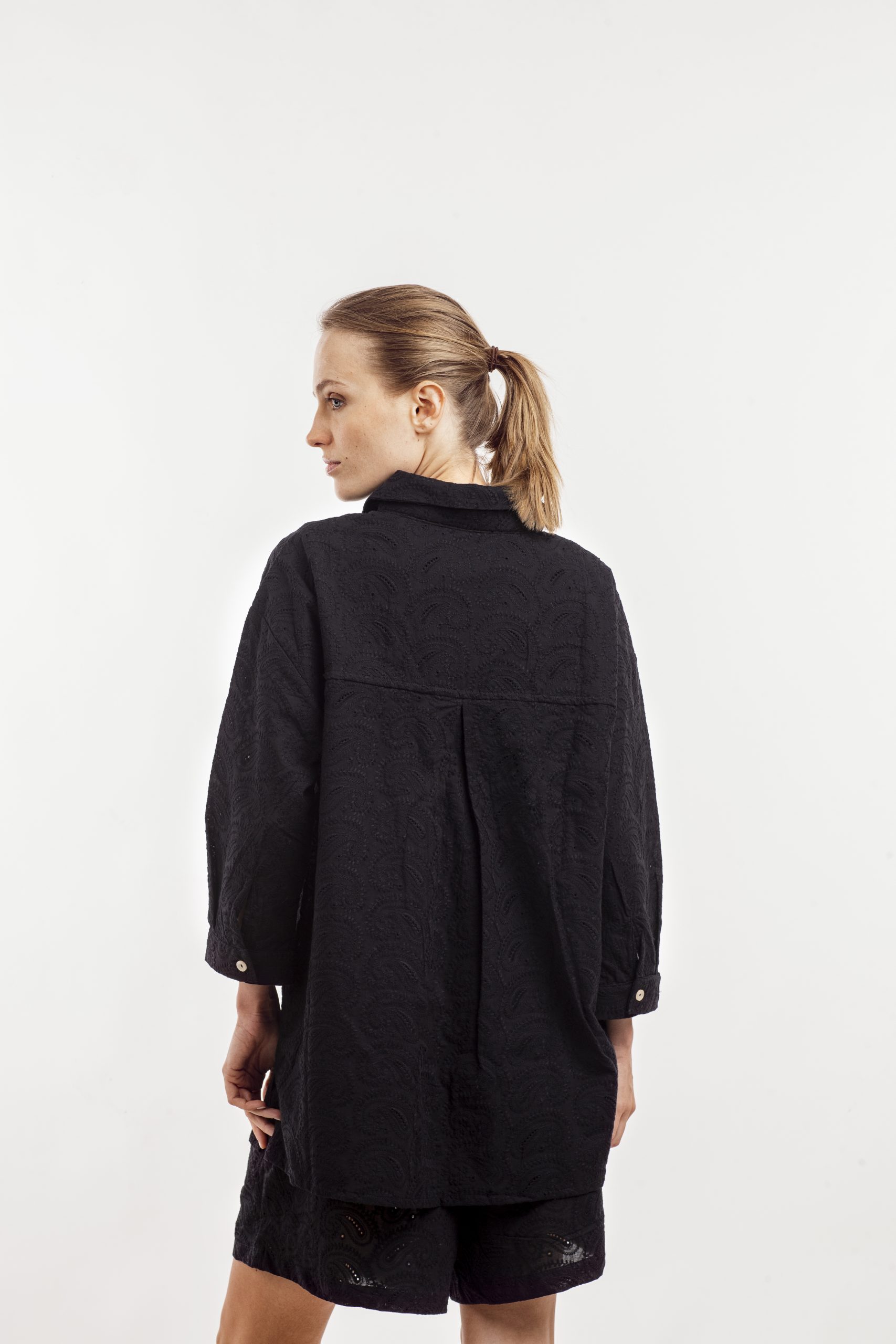 La camisa oversize de manga 3/4 incorpora cuello clásico camisero, botonadura oculta y bolsillo frontal, logrando una silueta limpia, moderna y muy favorecedora. La espalda con apertura suave aporta movimiento y un oversize equilibrado que suma sofisticación.